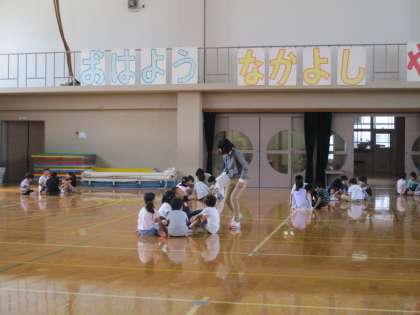 学校探検の前に,1年生と顔合わせをしました。グループで自己紹介をした後,貨物列車をして遊びました。みんな楽しそうに遊んでいました。