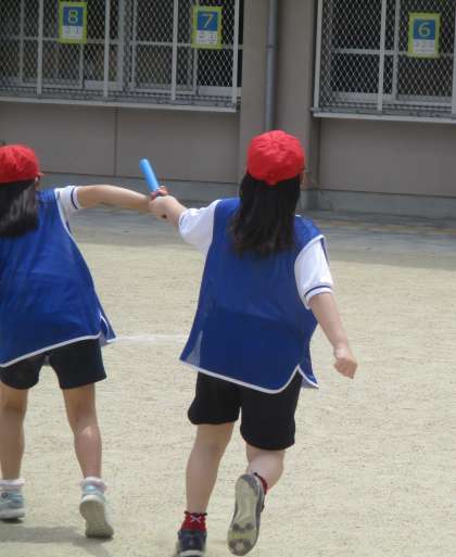 一生懸命走る姿が素敵。バトンを次の人に渡す時は「はい。」と声をだすことも忘れずにできました。友達への「がんばれー。」の声援が運動場に響いていました。
