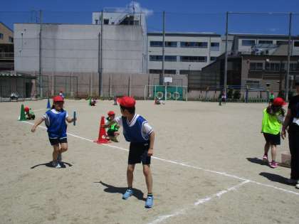 今日は,3年生の「リレー」の学習としては最終回でした。パスの仕方やテイクオーバーゾーンの使い方など,最初のころとくらべると少しずつ上手になりました!