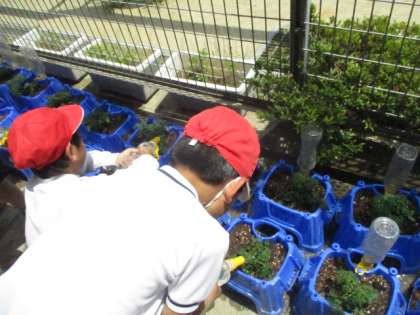 2年生ではミニトマトを育てます。今日は,ふかふかの新しい土を鉢に入れて,苗をていねいに植えました。みんな「たくさんトマトができてほしい!」「どんどん大きくなってほしい!」と嬉しそうでした。
