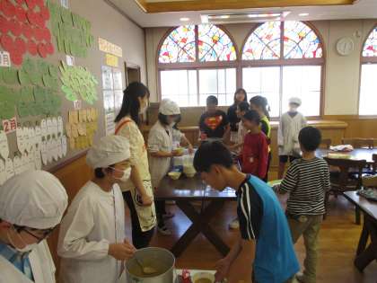 今日はランチルームでの給食でした。いつもとは違う場所,学年で食べる給食は和気藹々とした雰囲気でした。