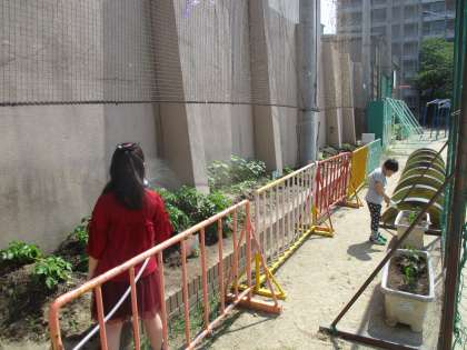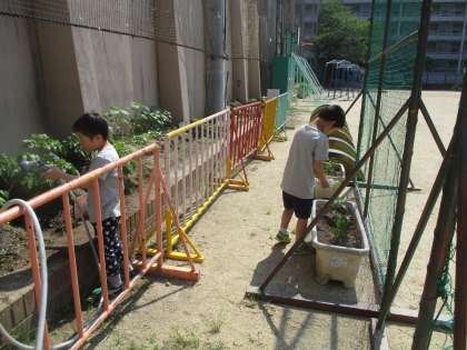 「おおきくなあれ。おおきくなあれ。」と優しく声をかけながら,水やりをしています。しし唐,じゃがいもといっしょに子どもたちの心も育っています。