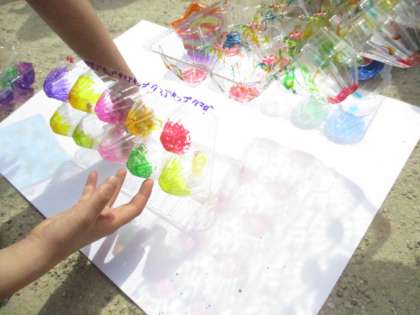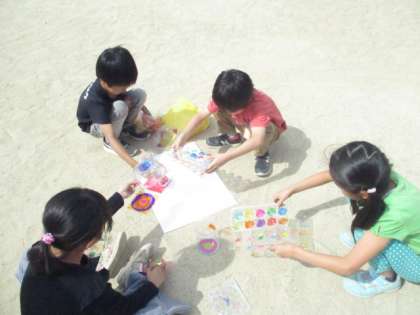 先週,残念ながら曇り空だったのですが,今週はぴかぴかに晴れた日があったので光を通して楽しみました。画用紙に光を通して色を映すと,みんな「きれい!」「ガラスみたい!」と喜んでいました。
