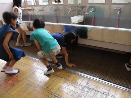 学校では,手洗い場で絵の具や習字を洗う時,トイレに行った時,