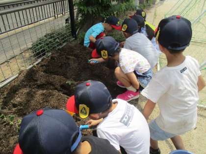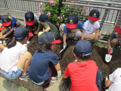 生活科で花を育てています。今日はひまわり,ほうせんか,風船かずら,コスモス,おじぎ草を新しく植えました。どんなお花が咲くかとても楽しみにしています。