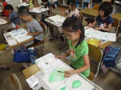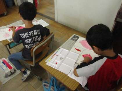 2年生になり,初めて絵の具を使いました。風船がだんだん大きくなると,色が薄くなっていくことに気付き,絵の具を水で薄めながら塗っていきました。