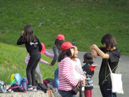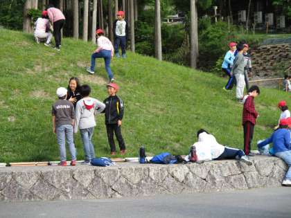 入浴までの短い時間に集合写真を撮ろうと集まりました。待っている間、芝生の坂道で遊びました。