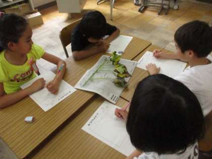 生活科「ぐんぐんそだて」では,2年生みんなで育てるサツマイモの茎の観察をしました。「根っこが出てる!」「どんな風に育つのかな。」と,みんな興味津々でした。