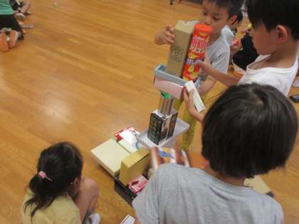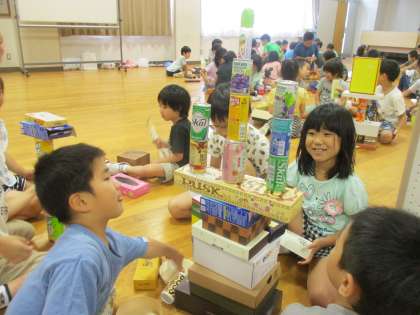 みんなで協力してやっていく中で,高く積めたとき,みんなで喜び合っていました。いろんな形ができましたね。