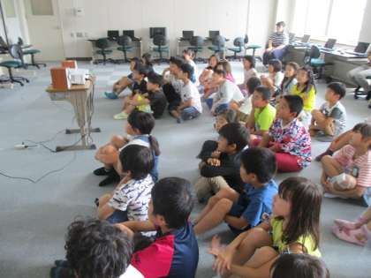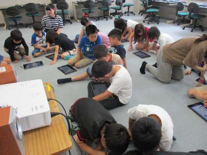 3年生も「プログラミング学習」の1回目を行いました。命令語を与えると,キャラクターが動き出します。キャラクターがもっとスムーズに動くように,命令語を加えていくと本当に歩いているように動きました。