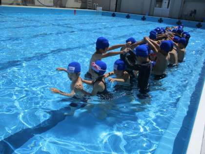 ペアでトンネルをつくって電車ごっこをしました。水位も上がって,少し歩きにくくなりましたが,楽しそうです。