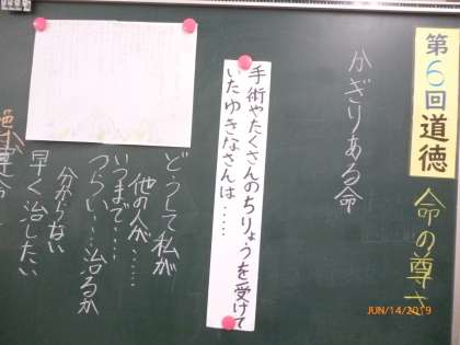 命の尊さについて考えました。少しくじけそうになった時に,死んでしまいたいなんて考えないで,自分や人の命は何物にも代えることができない大切なものであることを話し合いました。