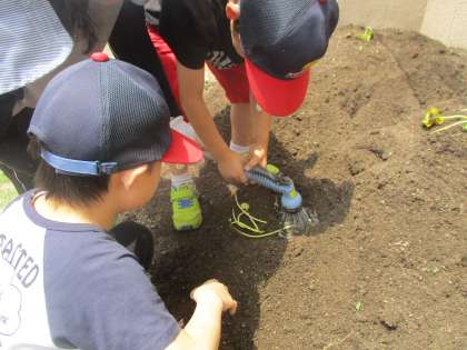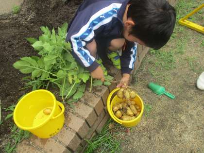 「わ〜いっぱいついてる!」と歓声をあげながらジャガイモ掘りをしました。4本の苗から60個近く採れてびっくりです。お誕生日会や三校合同交流会の調理実習で使う予定です。ジャガイモのあとには,サツマイモの苗を植えました。プランターで育てているシシトウも収穫の時期がきました。「みいつけた。」「まだ赤ちゃんやから明日にしよう。」と言いながら,子どもたちは収穫を楽しみにしています。