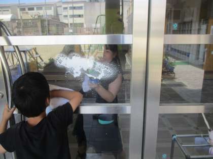 道徳『みんなのために』でげた箱近くの窓ふきをしました。クリーナーをシューっとかけ,雑巾でふき取ります。雑巾を見て「わーーーきたない。」窓ガラスを見て「ぴかぴかや。」と声があがりました。窓ガラスがきれいになったことに気づいたお友だちが「きれい。」「ありがとう。」と声をかけてくれて,3くみのみんなはとってもうれしそうでした。
