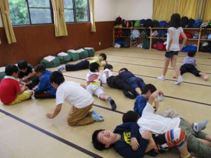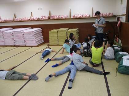 ディスクゴルフを楽しんだ後、お風呂準備と寝具準備です。全員一つ一つきちんと取り組んでいます。そのため時間にゆとりができ、約20分間のくつろぎタイムです。畳で寝転んだり、おしゃべりをしたりゆったりとした時間を過ごしています。