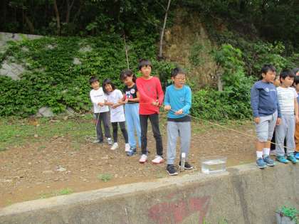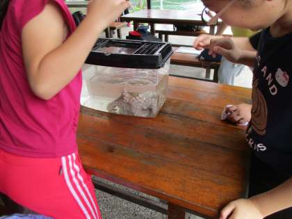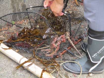 仕掛けたかごの中に何がいるか楽しみです。みんなでかごを引き上げました。魚が入っていた班や海藻しか入っていない班があれば、なんと蛸が入っていた班がありました。