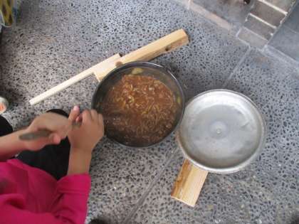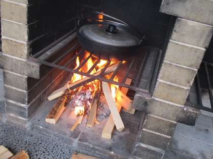 かまどの火に鍋をかけ、煮上がるのを待ちます。玉ねぎがしんなりしてきたら、ハヤシライスのルーを入れます。