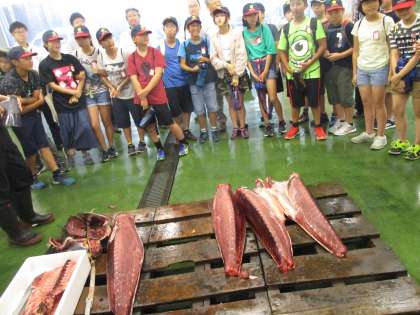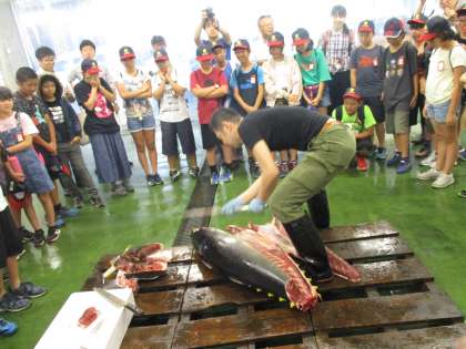 マグロの解体作業には子どもたちも大興奮でした。目の前の大きなマグロがあっという間に解体されていきました。