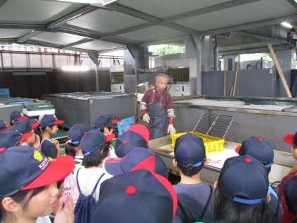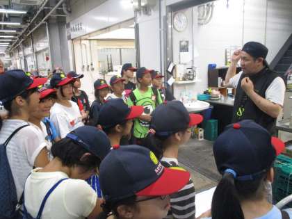 仲卸店舗(鮮魚)では,はもの骨切りの見学をしました。いけすでは活魚に触る機会があり,子どもたちはこわごわ魚に触れ,ピチピチと跳ねる魚にびっくりしていました。
