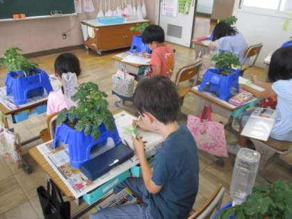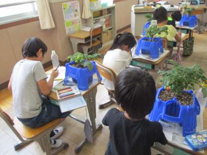 生活科の「ぐんぐんそだて」の授業で,ミニトマトの観察をしました。もうたくさんの実を収穫している人もいますが,じっくり見てみると茎にでこぼこがあったり,赤ちゃんの実ができていたり…。新たな発見をしていました。