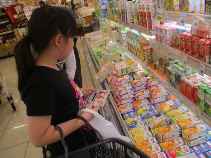先週に引き続いて学校の近くのスーパーにやってきました。今日は7月にお誕生日をむかえるお友だちの,お誕生日で作るゼリーとしし唐ウインナーの材料を買いました。