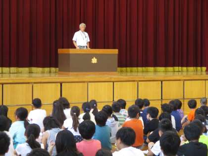 始業式では,学校長が全校に向けて夏休み前の約束「健康に過ごすこと」について児童に問いかけ振りかえりをしました。同時に元気に登校できる喜びについてお話しました。どの子も落ち着いて満足した表情で聞くことができました。