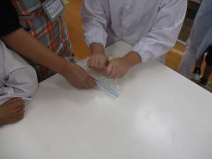 ピザをみんなで作って,友だちの誕生日をお祝いしました。ピザは生地から作りました。袋に強力粉,薄力粉,オリーブオイル,ドライイースト,水を入れて,こねました。