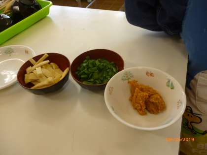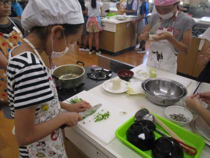 今日は,調理実習「みそ汁を作ろう」でみそ汁を作りました。大根と油揚げ,ネギのみそ汁です。いちょう切り(大根)やたんざく切り(油あげ),小口切り(ネギ)も上手にできていました。