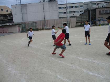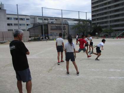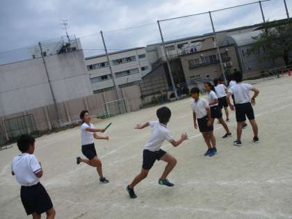 休み時間にリレーに出る選手が自主的にバトンの練習をしていました。高学年リレーでは走るスピードももちろんですが,バトンパスにも注目していただけたらと思います。