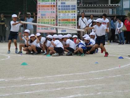 3年生 団体競技を行いました。台風の目です。回転中にかかる力をどのように支えるかを考えて,立ち位置や姿勢などについてもチームで作戦を立てて取り組んできました。子どもたちも真剣な中にも試合を存分に楽しむ様子が伺えます。