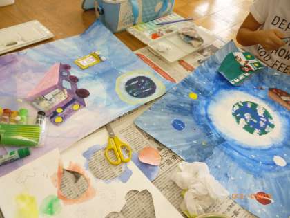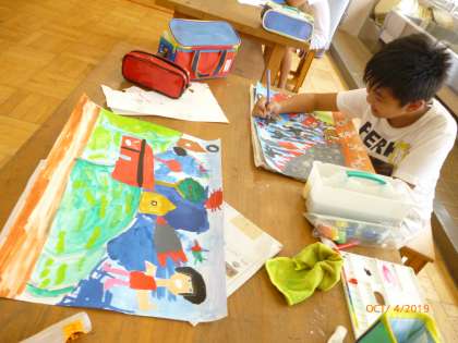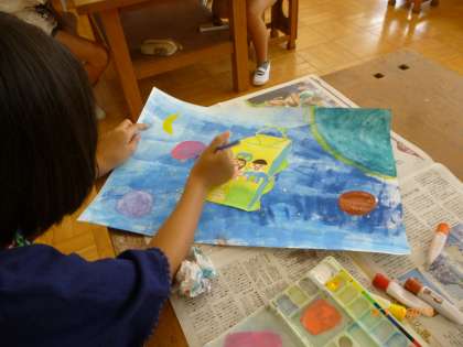 5年生は「いえでででんしゃはこしょうちゅう?」という本を読んでお話の絵を描きました。みんな想像した楽しい絵を一生懸命描いています。
