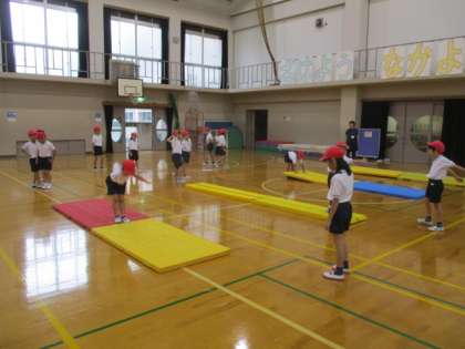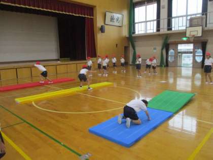 体育科では,マットあそびの学習をがんばっています。準備にも慣れてきて,たくさん技の練習ができるようになってきました。