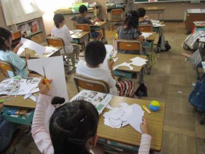図画工作科で,「はさみのあーと」の学習を行いました。はさみで思うままに切ること,できた形を並べてイメージを膨らますことを楽しみました。