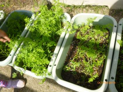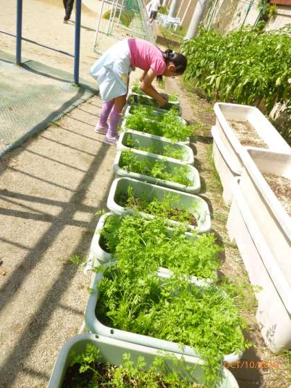 種まきをした人参も間引きを経て,このように大きく育ってきています。
