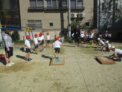 片足で踏み切るのが難しかったけど,ちからいっぱい跳びました。両足での着地はばっちりきまりました。記録係,すなならし係の仕事や後片付けもがんばりました。