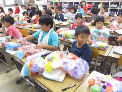 ビニール袋とお花紙を使い,楽しい「友だち」というイメージをもってつくりました。「友だち」が完成すると,子どもたちは手のひらに乗せてみたり,だっこしてみたり・・・大切そうにしている姿がとても微笑ましかったです。