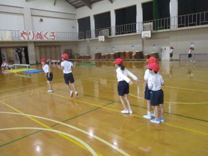 体育科では,まねっこあそびと平均台あそびの学習が始まりました。平均台あそびでは,手でバランスを取りながら進む姿が見られました。