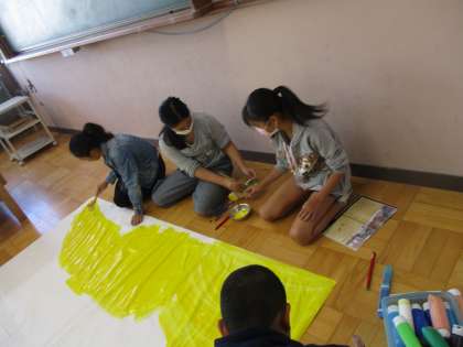 学習発表会に向けて背景の制作をしています。背景部という部活が発足しました。有志のメンバーで黙々と背景に色を付けています。完成が楽しみです!