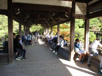 泰平閣の上で一休み。紅葉した葉と池を見ながらリラックスした様子でした。