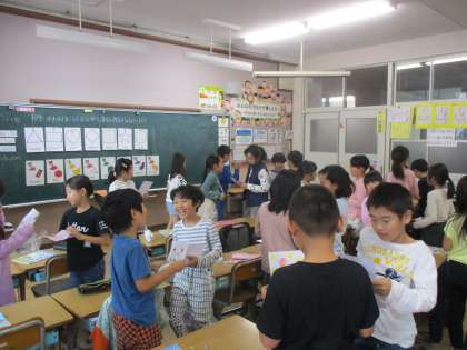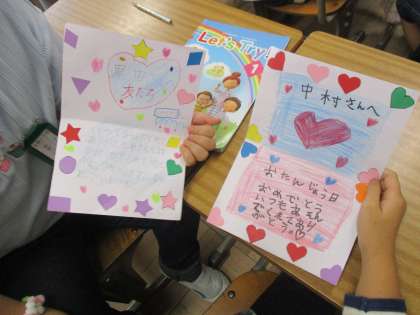 自分の作ったグリーティングカードに,どんな色や形を使ったのかを英語で伝え合ったあと,お互いに見せ合いました。お家の方に向けて,友達に向けて…それぞれに,すてきなグリーティングカードができましたね。
