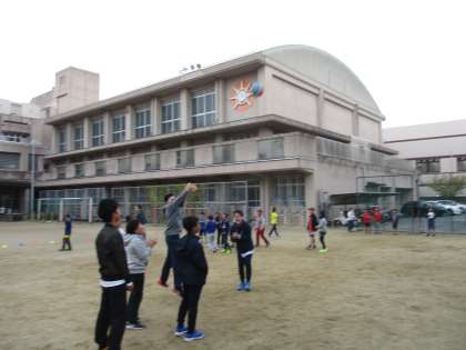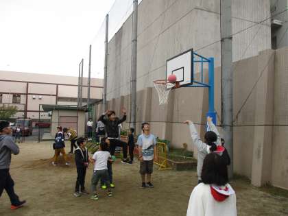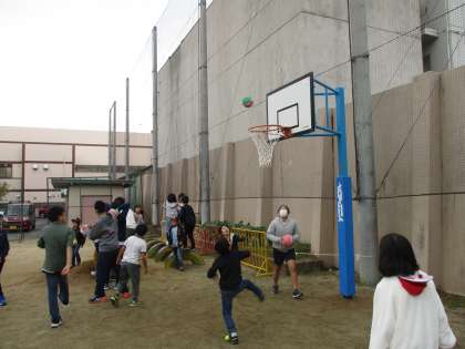運動場に新しい遊び場ができました。バスケットボールのリングです。学年問わず,仲良く遊んでいる姿が見られます。