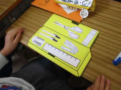 研究授業で学習した筆箱の中身の言い方を使い,学校の先生に向けた筆箱を作りました。