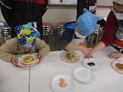 朱雀第三小学校でクリスマス会をしました。ホットケーキを焼いて,サツマイモクリームやスプレーチョコで飾りつけしました。食べているときにサプライズ!!!!サンタクロースの登場です。子どもたちは,びっくりして思わず立ち上がってしましました。とってもきれいなクリスマスカードをいただきました。