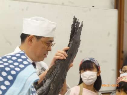 出汁は,利尻昆布と九州のカツオでとります。大きくて立派な昆布にみんな目が点になりました。とてもいい香りがします。