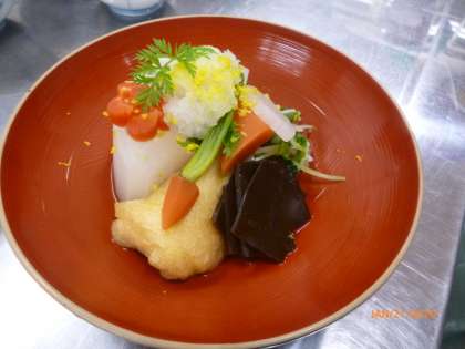 大根の白,人参の赤,壬生菜の緑,ゆずとお揚げの黄色,昆布の黒という5色の組み合わせがとても美しいお椀です。