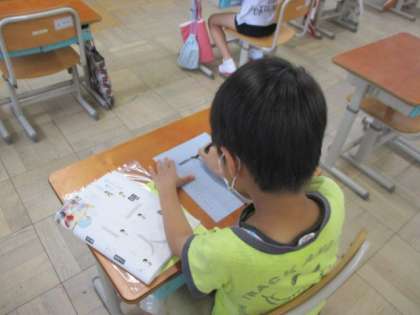 今年からは,はらいやはねの感覚を理解できるようにするため,水書用の筆を使った学習も進めていきます。