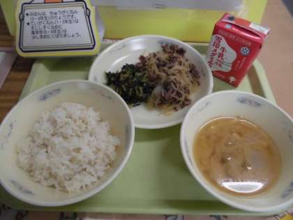 今日の給食は,「麦ごはん・牛乳・牛丼(具)・だいこん葉のいためもの・いものこ汁」でした。給食再開4日目,今日はBグループの児童たちが給食を食べました。毎回の手洗いも丁寧に洗えるようになってきています。