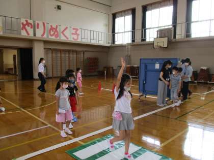 その後,実際の道路に見立てた体育館を「右・左・右・後ろ」をよく見て,順に歩きました。
