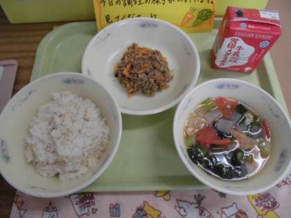 今日の給食は,「麦ごはん・牛乳・おからさば丼(具)・トマトだご汁」でした。