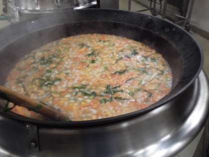 だご汁は,九州地方の郷土料理で,給食では,これから旬を迎えるトマトをだんごと汁の実として使っています。「おからさば丼」と共に,トマト色のかわいいだんごが入った具だくさんの汁物は,食欲が落ちやすいこれからの季節にぴったりの献立でした。